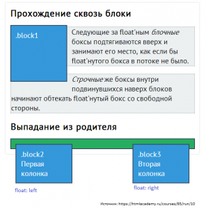 Свойство float включает режим “обтекания” — блок прижимается к левому или правому краю родителя и ужимается по ширине под свое содержимое. С той стороны, которая не прижата к краю родителя, появляется свободное место. Это место может быть занято другими элементами.